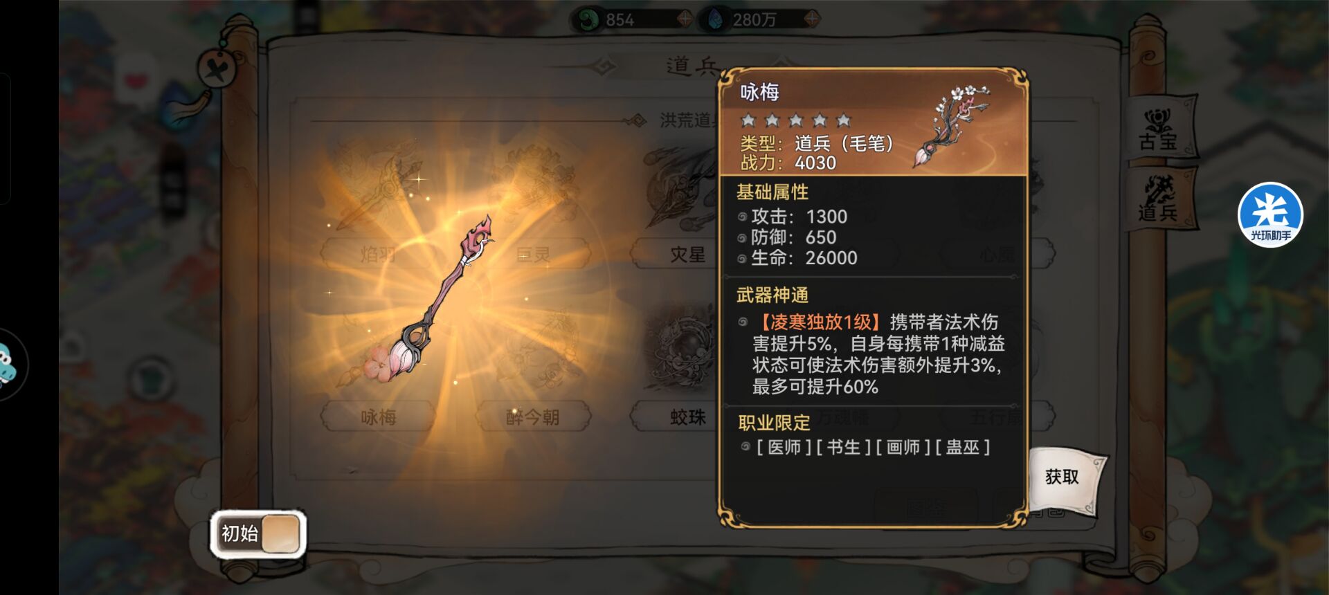 6:【咏梅】—搭配推荐。毫无疑问这把道兵最适合的就是:书生和画师可以提高法术伤害,并且自身减益越多越多,造成的伤害就越高。