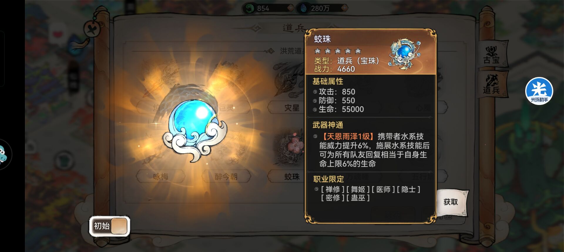 8:【蛟珠】—搭配推荐。蛟珠的效果是水系功法提升,释放水系技能后可以恢复所有队友的生命,辅助恢复类道兵。