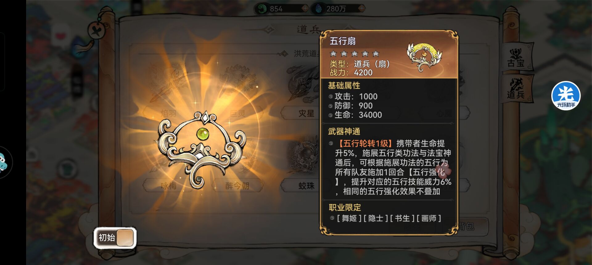 10:【五行扇】—搭配推荐。五行扇的效果可以提升一定的生命,并且可以根据队友佩戴的功法来提升队友的功法威力。