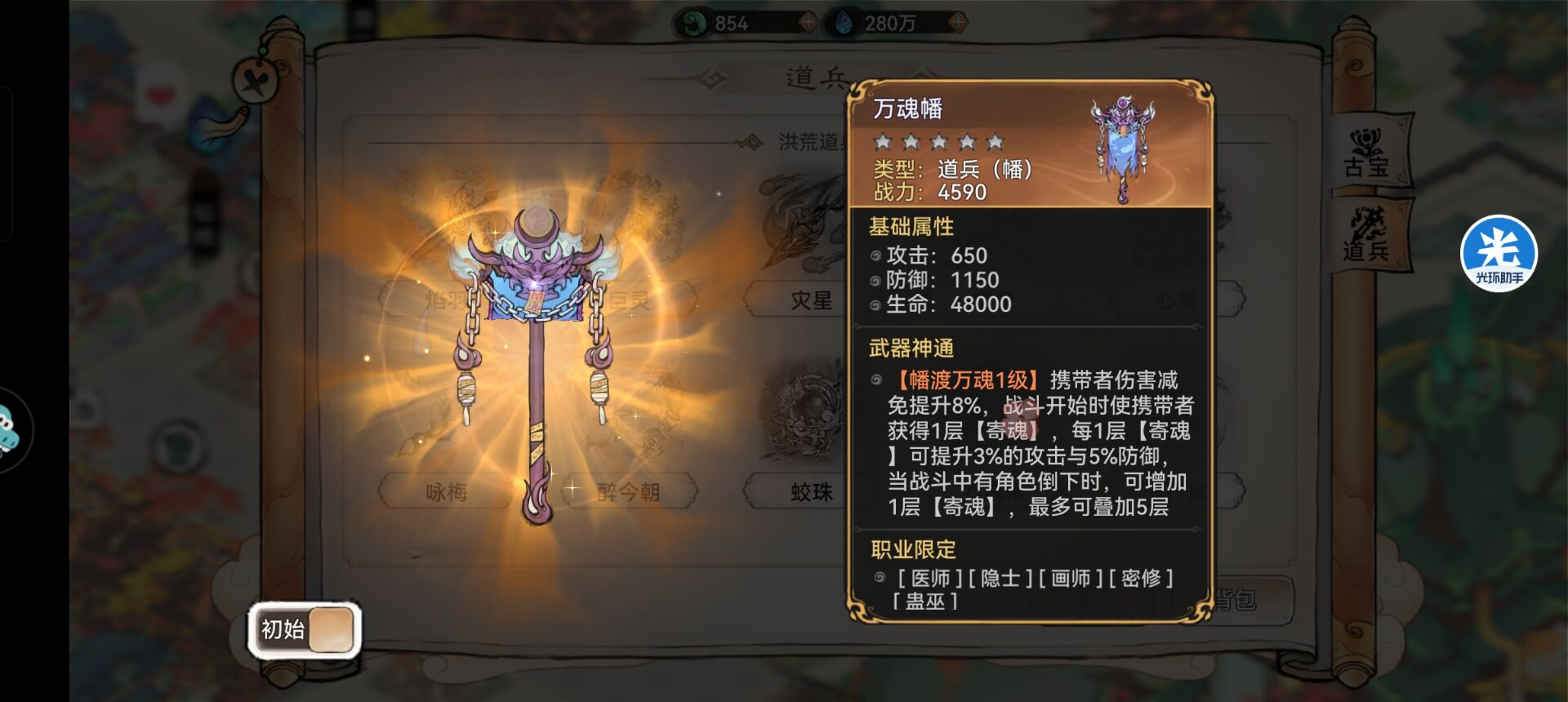 9:【万魂幡】—搭配推荐。效果是提升伤害减免,并且可以战斗开局可以提升一定的攻击和防御,叠加五层。属于攻守兼备的道兵。