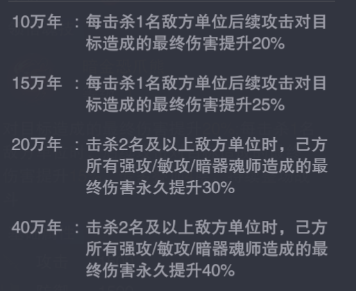 并且这个效果在后续直至40万年的熊环效果上都不会出现太大的质变,依然是维持基础效果时的适用场景,不过从20万年开始额外加入了一些定向条件下的全主C增伤,这点至少......对部分3桩副本也会有更好的帮助。
