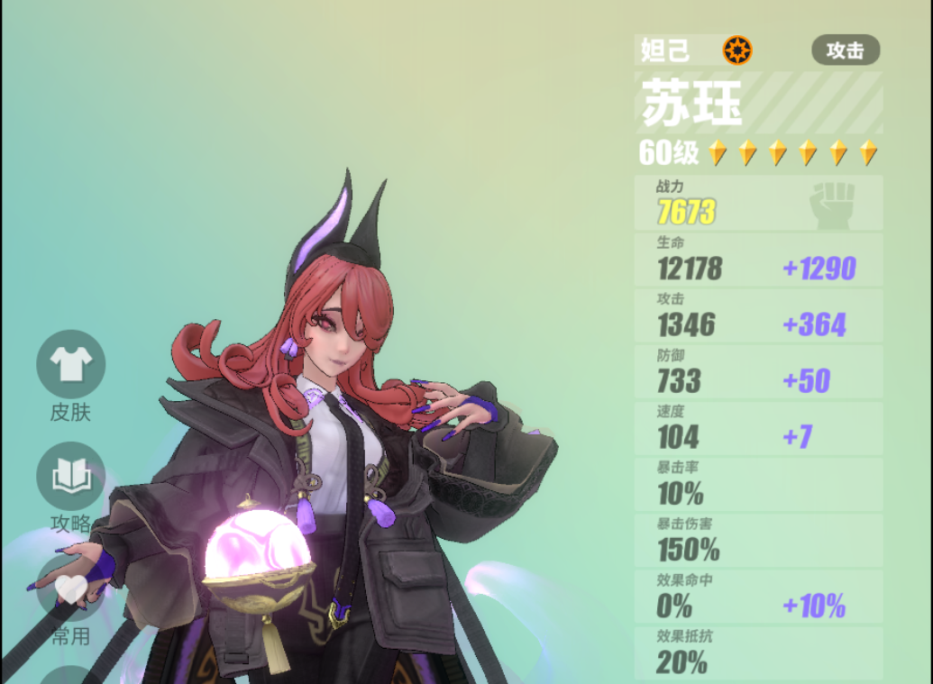 大王,你要死了?没事,妲己给你续了一回合。你要打奴家,你已经被魅惑,自己会更痛哦。大招单体,让敌方抵抗力下降100%,让队友的是失手率下降100%,受到伤害提升20%,回合开始前,获得1回合挑衅。当队友受到致命伤害,免死,可立即释放技能,放完再死。自身伤害受攻击和速度影响,二技能为多段,自身受到减益方攻击,反弹50%伤害加自身攻击力75%的真实伤害。妲己整体偏PVP,PVE有增伤,打Boss也不错。6共鸣收益最大,其他效果一般,不是非常明显。可搭配梅维斯。