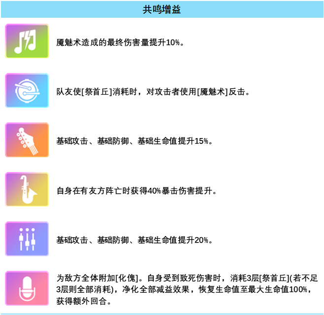 被动效果:战斗开始时,自身获得9层[祭首丘]。任意队友受到致死伤害时,消耗1层[祭首丘],净化其全部减益效果获得额外回合,然后将死亡延缓至回合结束后发生。