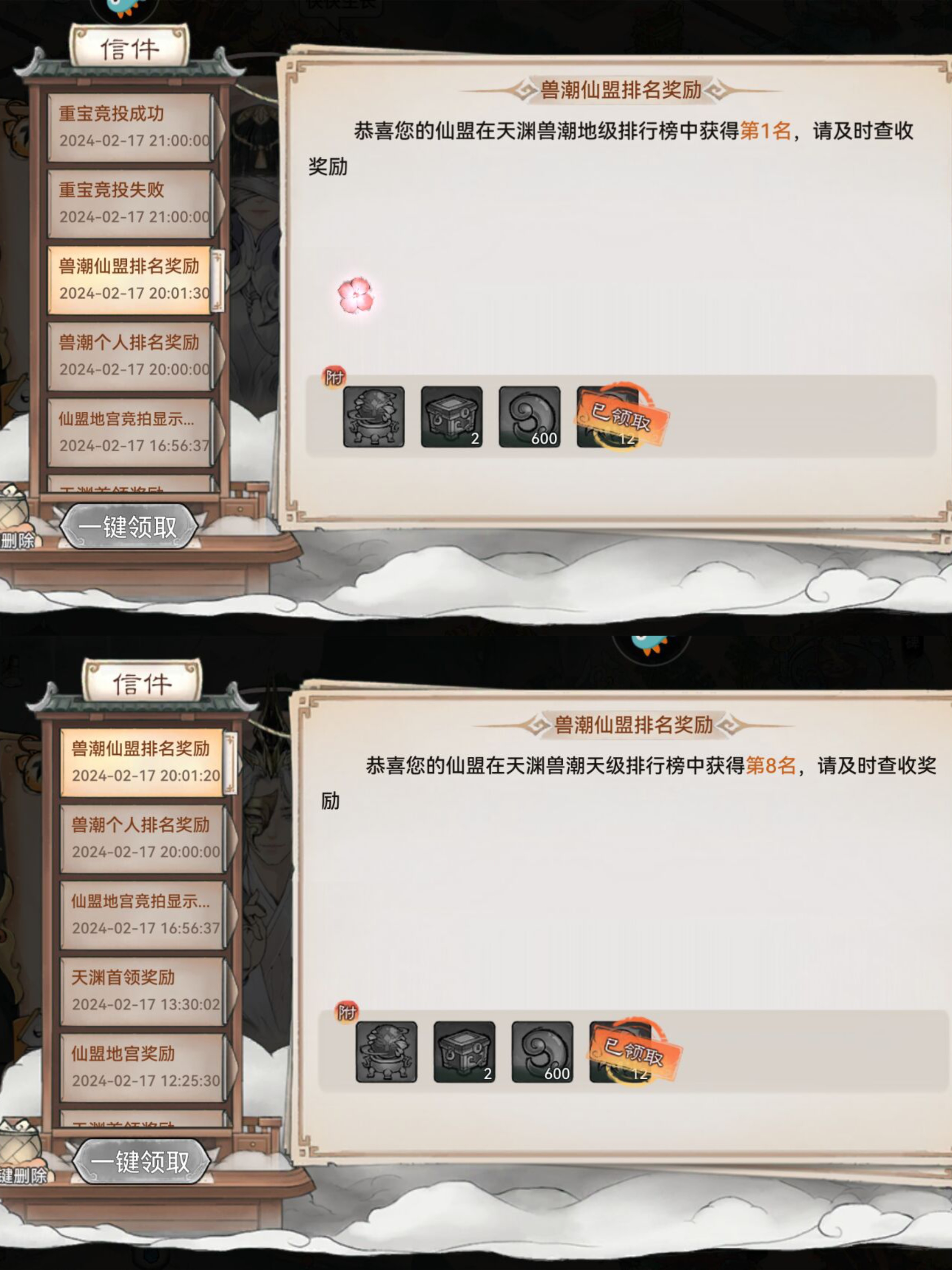 同时仙盟的排名奖励收益也不是很大,【地级第一名的仙盟奖励】和【天级第十名的仙盟奖励】一摸一样。