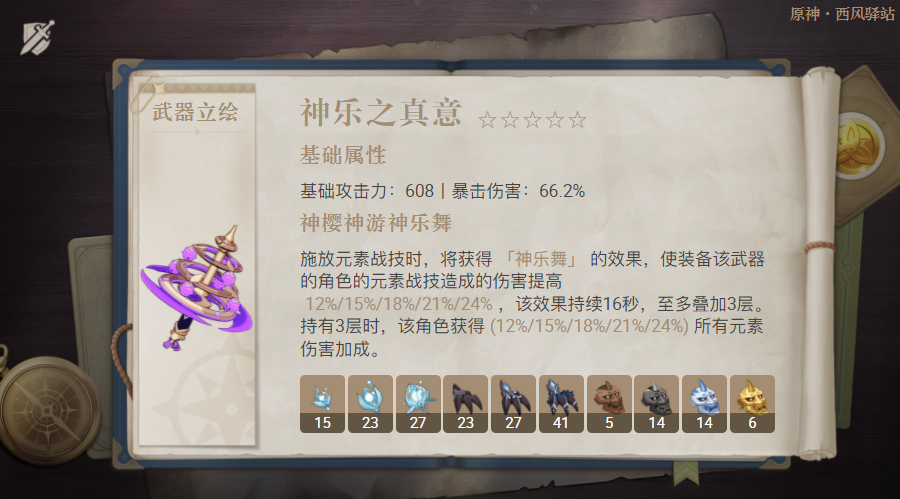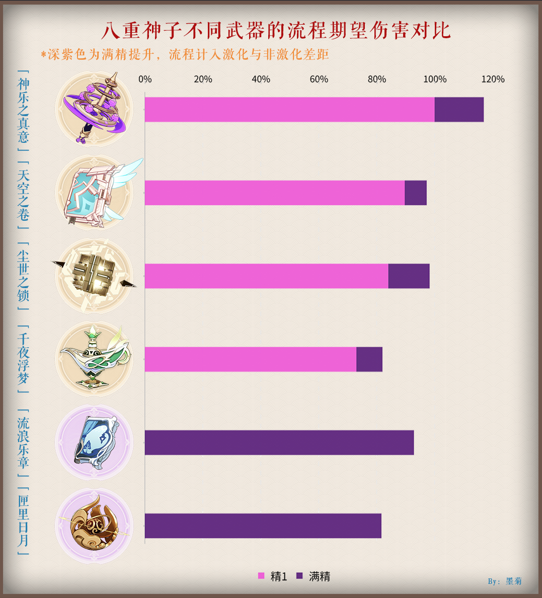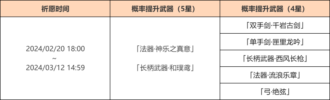 祈愿分析丨普池武器再up,外观毕业的同时你还能获得什么?神乐之真意+和璞鸢卡池讲解原神 - 新闻星发布于 2024-02-22关注 ▌PART 01:祈愿介绍 祈愿说明:通过消耗「纠缠之缘」抽取,每十连必得一个紫色品级(四星)的角色或武器(不包括出金的十连),每80连必得一个金色品级(五星)的武器,获取后重置保底-次数。单次祈愿消耗160原石。*PS:其中「法器·神乐之真意」「双手剑·千岩古剑」为限定武器。▌PART 02:UP武器价值分析※ 「 强度指数 」根据武器本身面板、词缀效果、武器技能进行评价,通常伤害提升幅度更大的武器该项评分更高。※ 「 抽取价值 」根据武器的通用性、未来增值空间等衍生价值进行评价。※ 四星武器主要简析「千岩古剑」。 「法器·神乐之真意」 强度指数:★★★★★抽取价值:★★☆☆☆(两星半)装备评价:五星法器重极致特化元素战技伤害的武器,想要快速启动武器效果需要在短时间内多次施放元素战技,目前能够达到这一要求的法器角色并不多。「八重神子」:八重神子的元素战技伤害在其流程伤害里占比极高,元素战技冷却时间短且有三次充能,能在短时间内快速叠满该武器特效层数,是其当之无愧的毕业武器。 「纳西妲」:如果不考虑固有天赋提供的元素精通辅助加成,纳西妲佩戴该武器时会有更高的输出期望(但不多),这点可以参考上期纳西妲复刻时的数据,这边就不再放了。「丽莎」:该角色可以通过连续点按战技来叠加武器层数,是其长按战技核爆的专用武器。「鹿野院平藏」:对平藏来说,该武器同样是其战技核爆的专用武器,但需要较长的启动时间。精炼提升较高。抽取建议:该武器专属性较强,除了八重神子与纳西妲以外,不推荐为其他角色抽取。 「长柄武器·和璞鸢」 强度指数:★★★★★抽取价值:★★★☆☆装备评价:该武器有较高的基础攻击力,因此副词缀暴击率权重并不高,主副词缀身材整体较为通用,武器特效的触发方式契合驻场输出角色。「魈」:该角色元素爆发与固有天赋能在增伤区提供极高加成,角色本身对攻击力有较大需求,需要佩戴提供高攻击力加成的「辰砂往生录」,该武器的高白值与武器特效能够为其带来可观的面板攻击力。 「其他角色」:其他驻场时间较长的长柄武器角色诸如「雷电将军」「胡桃」「赛诺」「物理罗莎莉亚」「武神流钟离」等等也可以在没有其他适合武器时佩戴。抽取建议:常驻池武器,不推荐为魈以外的角色抽取。 强度指数:★★★★☆抽取价值:★★☆☆☆(两星半)装备评价:该武器与上期池子的限定武器「千岩长枪」有类似的效果,但目前璃月的双手剑角色只有四星,由其他地区的角色佩戴该武器则在一定程度对武器特效的上限有所限制。好在「嘉明」作为璃月四星双手剑角色扛起了输出大旗,让该武器在当今也能发出较为亮眼的光芒。 ▌PART 03:总结五星武器中「和璞鸢」有较高泛用性,「神乐之真意」则专属性较强,由于和璞鸢为常驻池武器,我个人推荐仅为神子下该池子。四星武器中「绝弦」「西风长枪」「流浪乐章」是常驻武器里较常用的武器,加上「千岩古剑」整体还算有不错的抽取价值,对五星武器有需求就安心抽吧~作者:原神西风驿站,墨菊