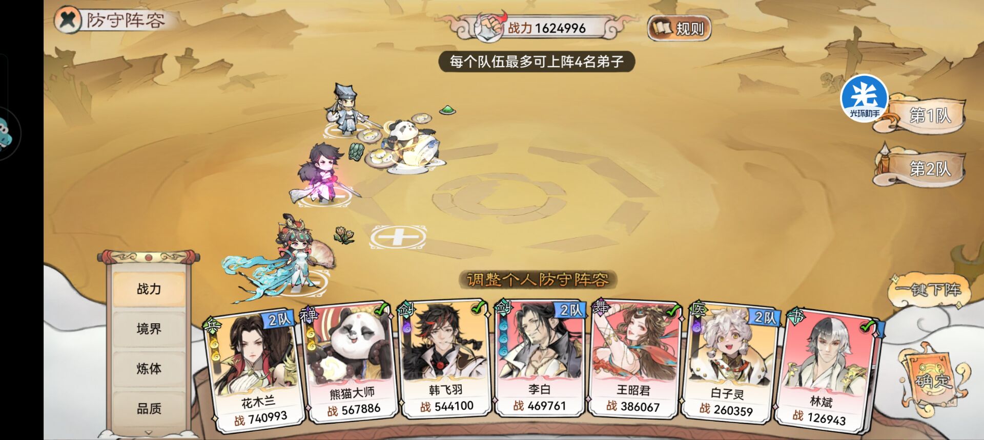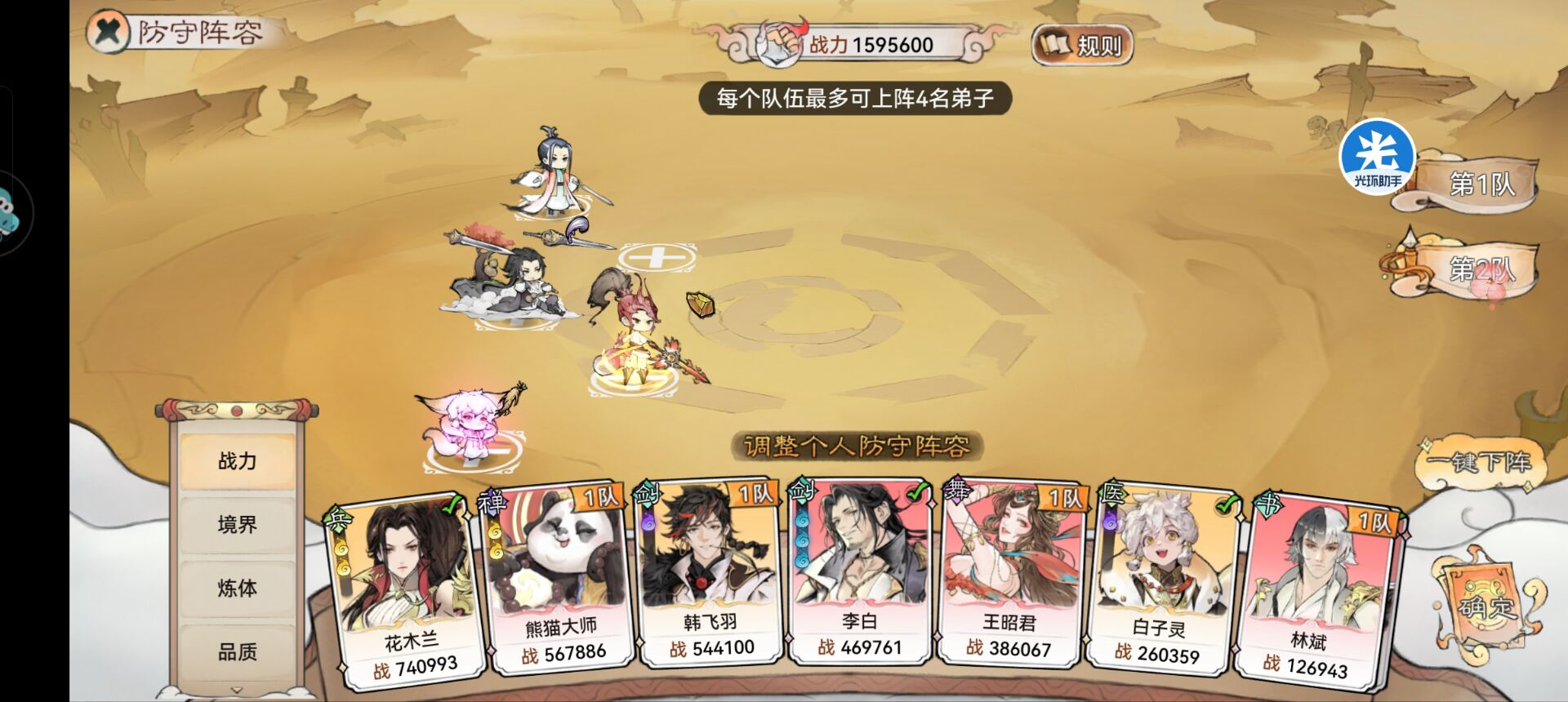 阵容搭配分为:【1队阵容】和【2队阵容】。每个队伍最多只能上阵4个弟子,其实仙盟战的这种队伍组合就明确告诉我们要去培养2队了。