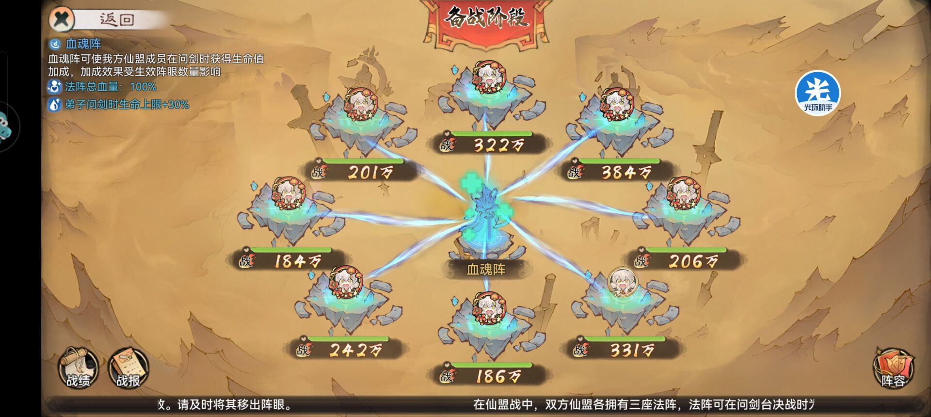 二:仙盟战—法阵和阵眼设置技巧。一共有3个法阵:血魂阵、戮仙阵、御天阵。
