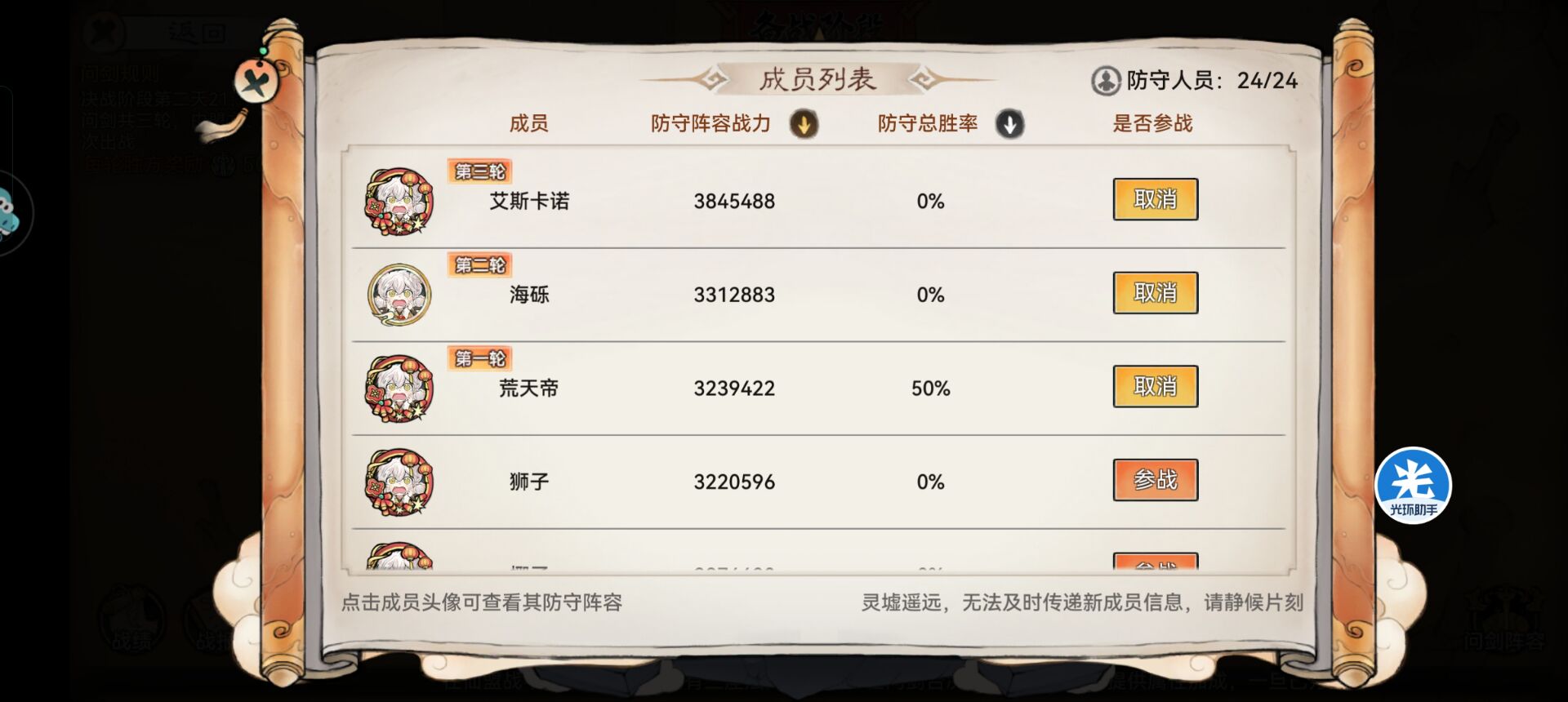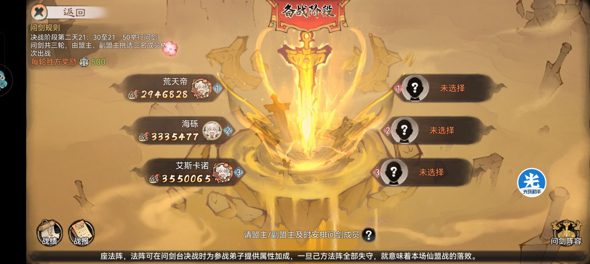 三:问剑台—玩法和安排技巧。问剑台就是我们最终决战的地方,问剑台只能由盟主和副盟主挑选3名成员出战。
