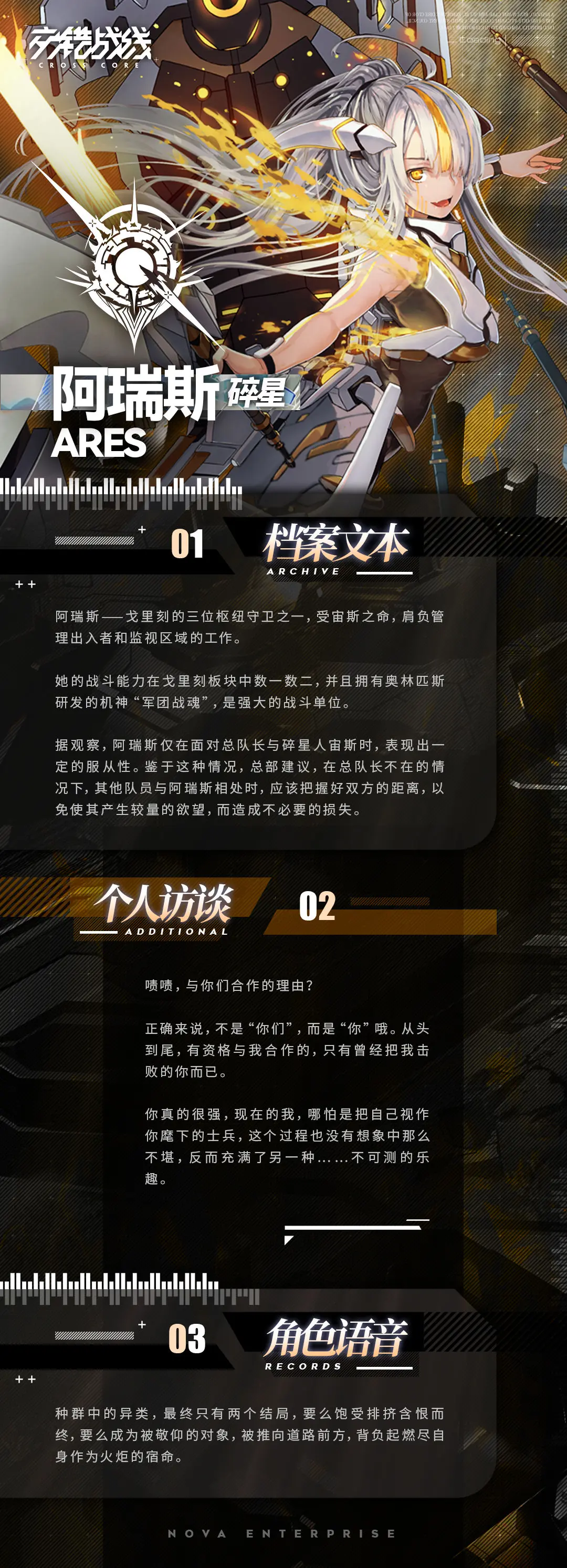 《交错战线》角色「阿瑞斯」光环资讯 - 二次元发布于 2024-02-23关注阿瑞斯——戈里刻的三位枢纽守卫之一,受宙斯之命,肩负管理出入者和监视区域的工作。她的战斗能力在戈里刻板块中数一数二,并且拥有奥林匹斯研发的机神“军团战魂”,是强大的战斗单位。总部十分期待她今后的表现。