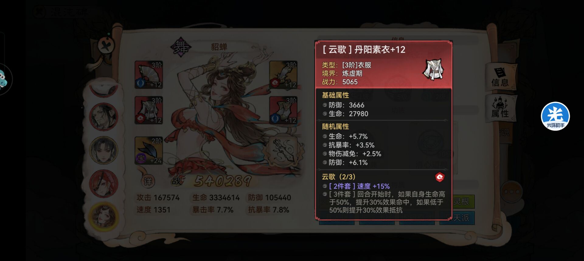①【云歌套装】搭配推荐。这个套装是三阶装备最为热门的套装,也是我们后续会一直使用的套装之一。套装的主要效果是提高速度和增加效果命中+效果抵抗。