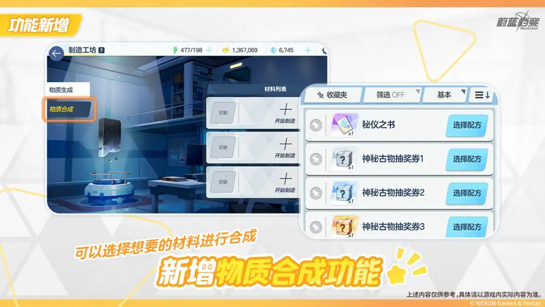 02月29日维护更新后,【制造工坊】将迎来一次升级,将新增“物质合成”功能。通过此功能,可将暂时用不到的素材,用于合成指定的抽奖券或选择券,获得老师想要的指定素材!接下来就让阿洛娜来详细说明吧!
