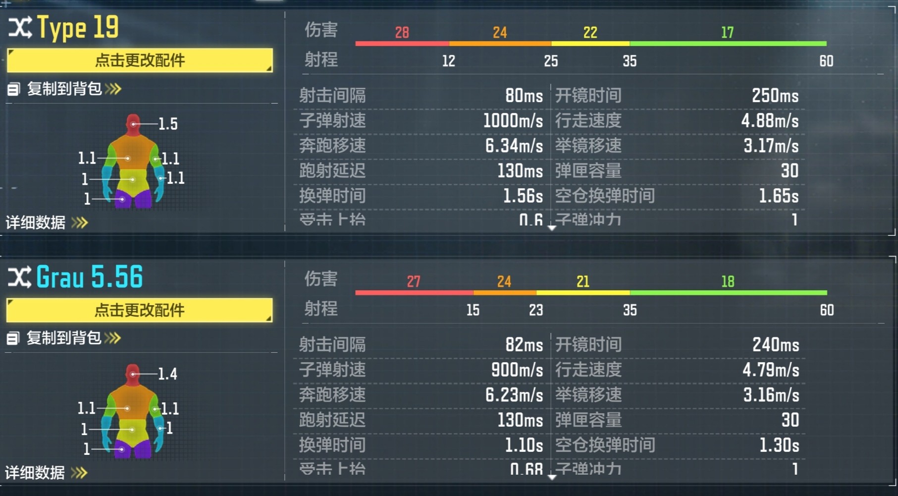 在当前版本中,Type 19拥有4段射程,伤害呈阶梯式衰减。第一段射程28点伤害,头部伤害1.5倍,因此命中1枪头部的情况下,还需要命中熊部或手臂一枪才可以带走,虽然爆发比格雷556高一点。但在实际作战中,都是打出全身稳定4枪,TTK=240ms,近战拉胯!而在第二段伤害中,命中熊或手臂2枪,全身4枪倒,比格雷556爆发还要高,提高射程之后中距240ms的TTK完全可以进入T0行列!第三段射程之后区别不大,但由于后坐力和精度都不如格雷556,因此命中率略低!综合上面的内容,我们会发现,Type 19的优势主要集中在第1和2段射程,而在中远距离则比较劣势,综合实力强于T1,位列T0.5,不适合小地图使用!