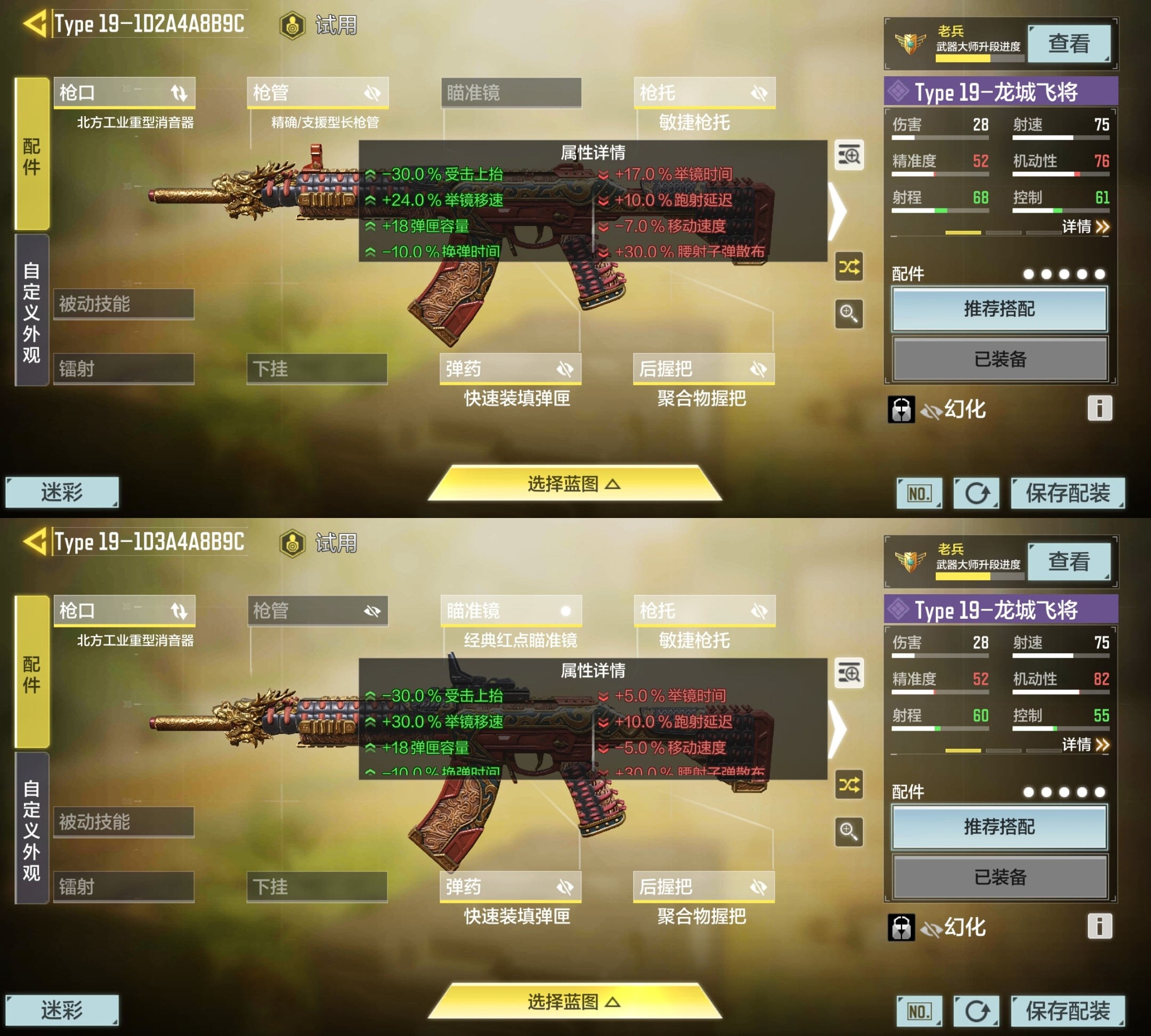 经过多次测试,老狼终于搭配出最舒服的枪械配件: Type 19核心射程TTK选择北方工业重型消音器和精确/支援型长枪管来将2段射程提升到37.3M,3枪致命距离可以覆盖中远作战场景!续航则给到快速装填弹匣提升续航能力!负面举镜属性则用聚合物握把来平衡,同时降低受击上抬,更好的在中远距离作战!负面属性跑射延迟则用敏捷枪托来平衡,同时大幅度提升举镜移速来提升复杂环境的生存能力。如果不喜欢机瞄的话也可以和老狼一样将枪管换成红点瞄准镜来提升舒适度,虽然二段射程降低5M,但是依然可以覆盖中段作战的!