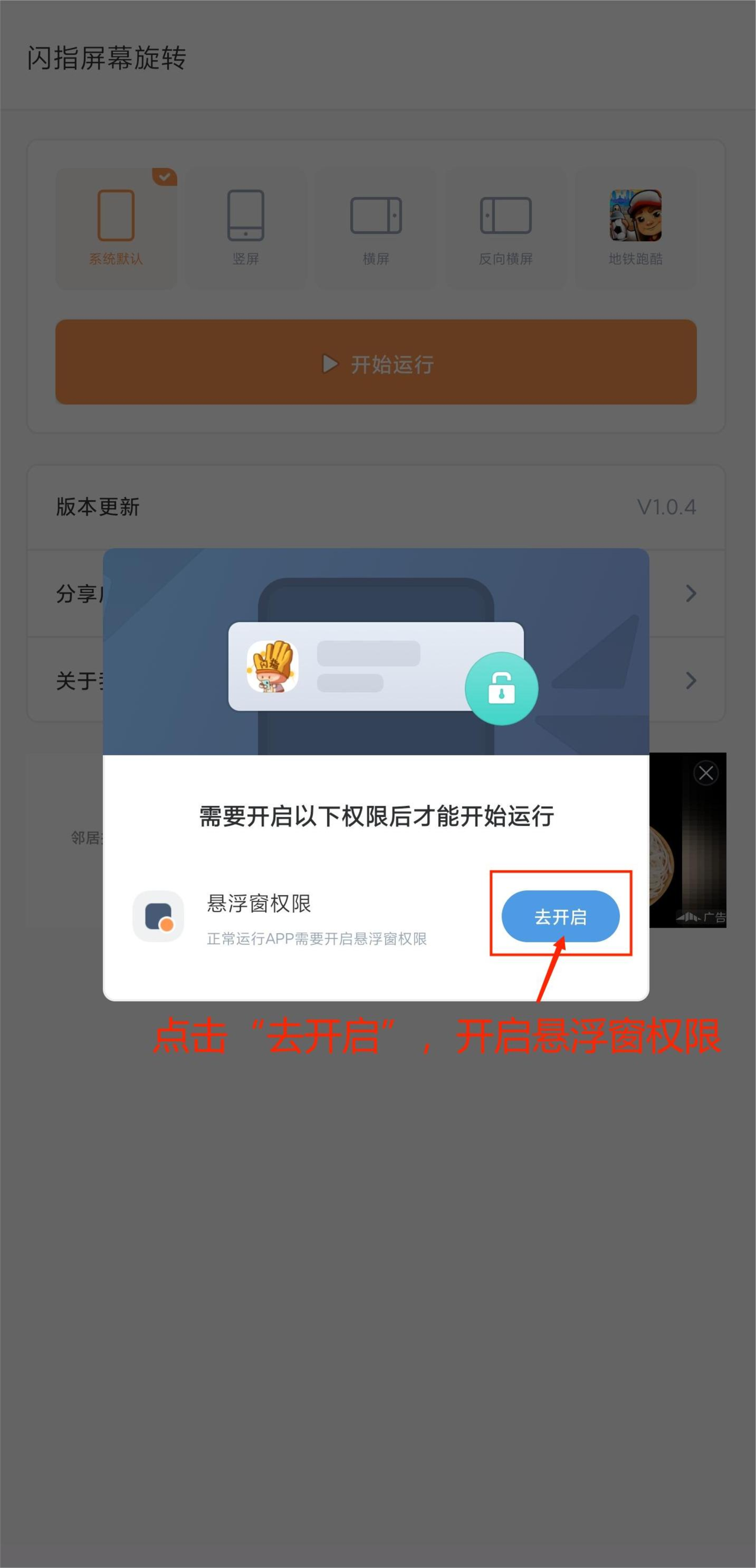 1.打开工具,会弹出一个提示,需要开启悬浮窗的权限,点击‘去开启’