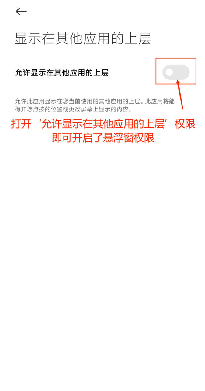 3.打开‘允许显示在其他应用的上层’权限即是开启了悬浮窗权限
