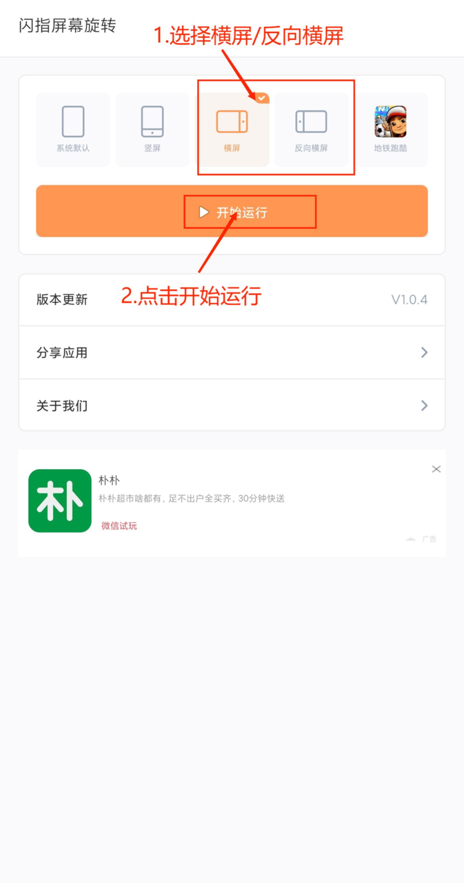4.开启好悬浮窗权限后,返回到手机桌面,打开‘闪指屏幕旋转’工具,选择横屏/反向横屏,点击开始运行,手机屏幕就会变成横屏模式啦