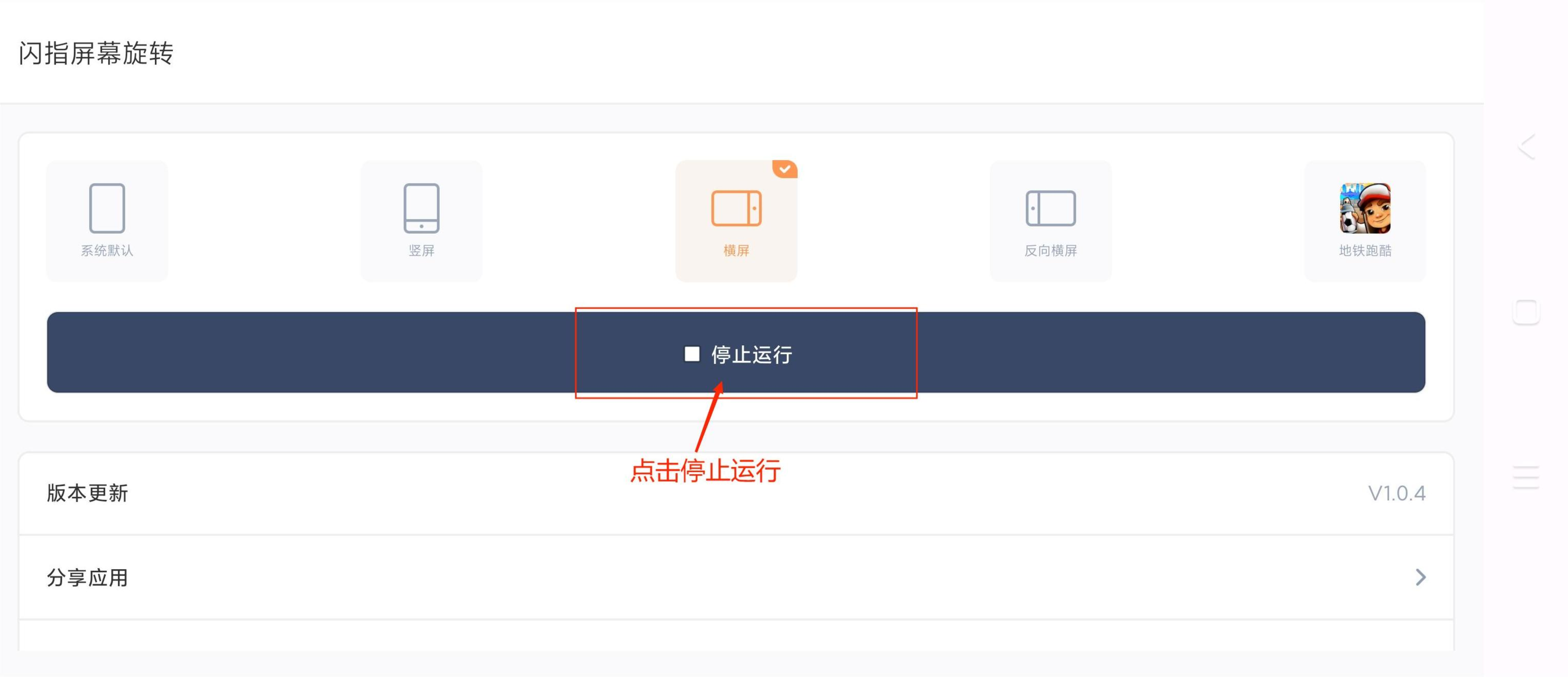 最后,要想关闭超广角视野玩法,返回到‘闪指屏幕旋转’,点击停止运行即可。