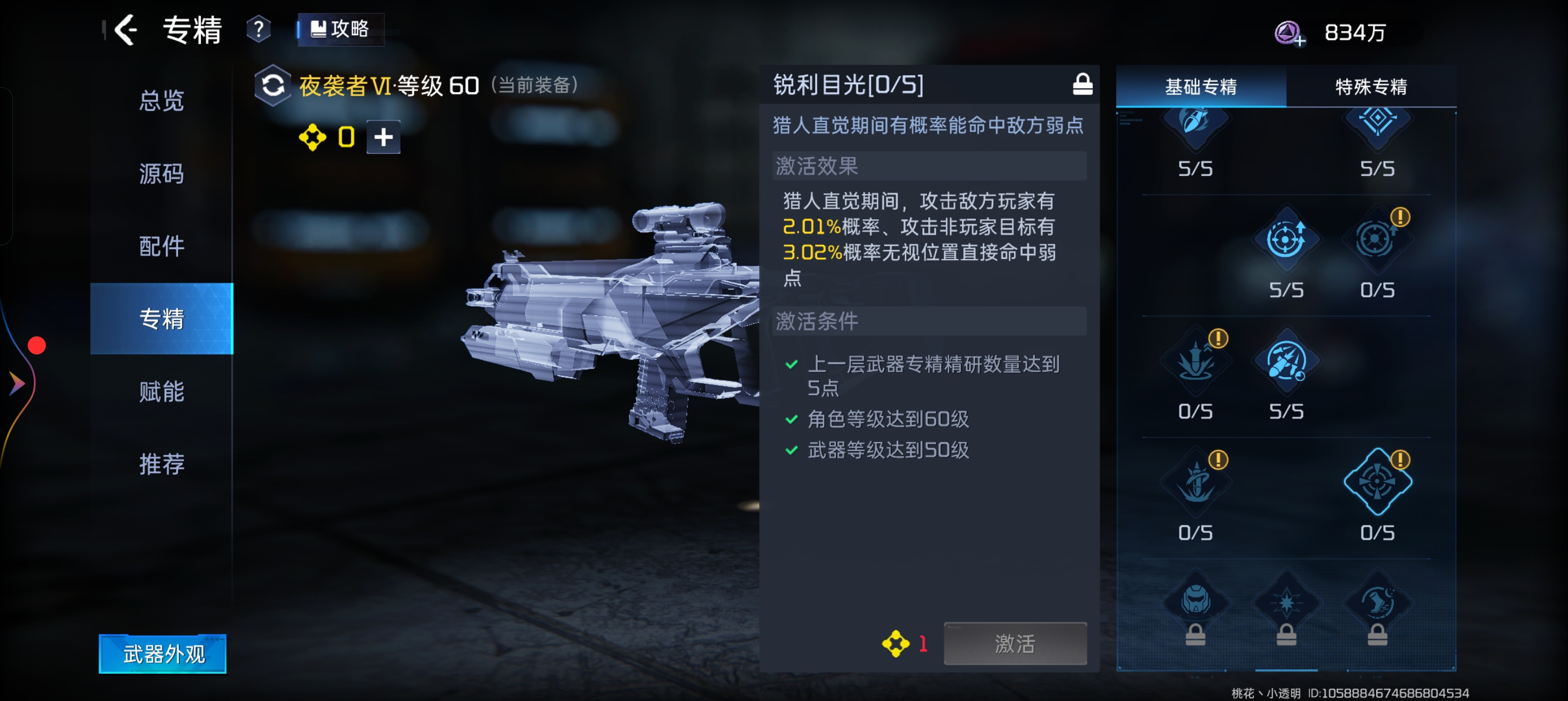 有的玩家选择【弱点强度】也是可以的,因为60级我们的夜袭者解锁了专精【锐利目光】。有几率直接无视位置命中敌人弱点,所以选择弱点加成也是非常好的。