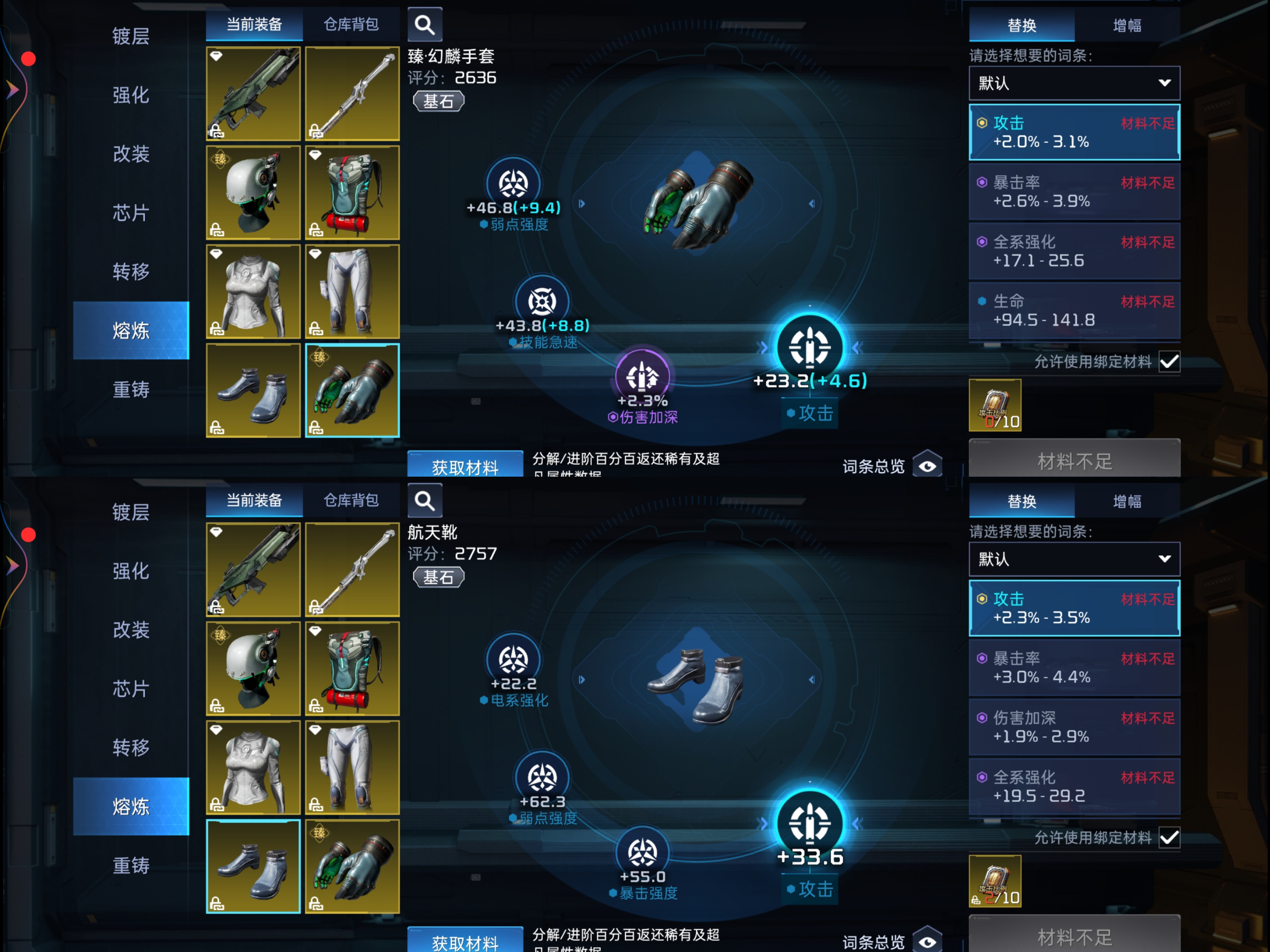 答:如果是氪佬玩家可以把蓝色的暴击强度换成金色的攻击。平民玩家就直接用暴击强度就可以,因为金色攻击力的熔炼数据价格高的吓人,平民玩家根本不可能去弄金色攻击,这是完全不现实的。