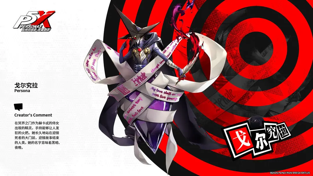 INDEX全书 |人格面具 Ⅱ『戈尔究拉』介绍女神异闻录:夜幕魅影 - 新闻星发布于 2024-02-28关注>>>PERSONA!『戈尔究拉』介绍在冥界之门作为赫卡忒的侍女出现的精灵。手持能够让人发狂的火把。她长久地站在迎接死者的大门前,迎接故事结束的人类。她的名字意味着黑暗、夜晚。