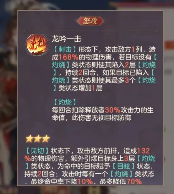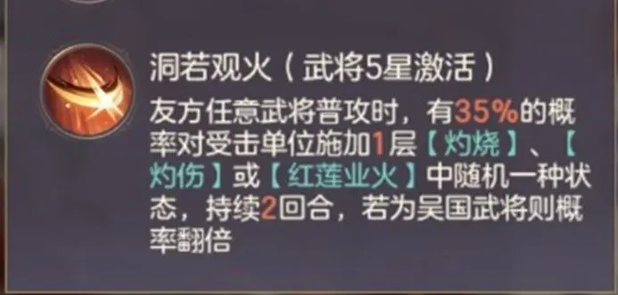 朱然最主要的输出来源,尤其是和吴国武将配合时,能大幅提高吴国武将的普攻作用,将原本鸡肋的普攻转变为火烧体系最需要的灼烧buff,60%的高概率让朱然可以频繁施加各类灼烧buff,配合自身见切形态下的怒攻引爆,能提供源源不断的真实伤害。
