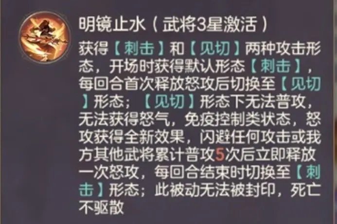 朱然的怒攻受到三星被动的影响,会切换两种不同的效果,由于三星被动的存在,形态切换非常稳定,同时形态切换的触发条件是每回合释放一次怒攻,相对于朱然的回怒速度,能很快触发,所以绝大部分时候朱然的形态是“见切”。
