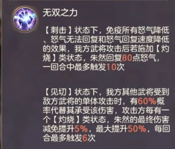让朱然在刺击形态下能稳定回怒,保障了朱然释放怒攻和切换形态的稳定性。见切形态下更是拥有了对队友的保护能力,高概率替队友承受单体伤害,在面对单点爆发类武将的攻击时有奇效,同时频繁替队友承受伤害的功能对朱然自身的坦度提出了很高的要求,而依据灼烧buff给予朱然的最终伤害减免能有效降低朱然受到的伤害,让朱然能替队友承受更多伤害。
