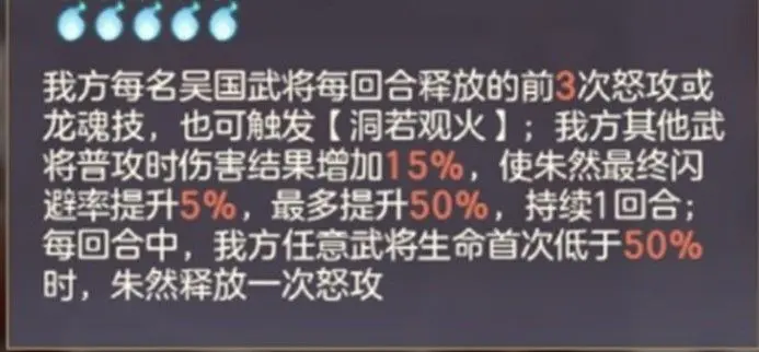 进一步提高五火被动的触发频次,在跟吴国队友配合时,极大地提高朱然施加灼烧类buff的速度,每名吴国武将的普攻、怒攻、龙魂技的价值都得到了有效提升。