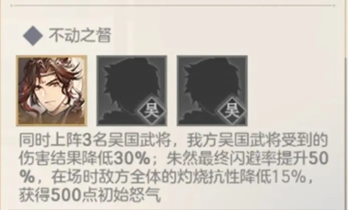 绑定吴国国家队的羁绊,让吴国武将承伤能力大大提升,30%伤害结果降低是非常珍贵的属性,50%的最终闪避率让朱然有极硬的身板,配合五火被动叠加的最终闪避率,能让朱然的闪避堆到一个可怕的程度,面对非必中伤害时游刃有余。额外提供的初始怒气加快了朱然开局切换形态的启动速度,降低敌方灼烧抗性的效果和火烧体系也是相得益彰。