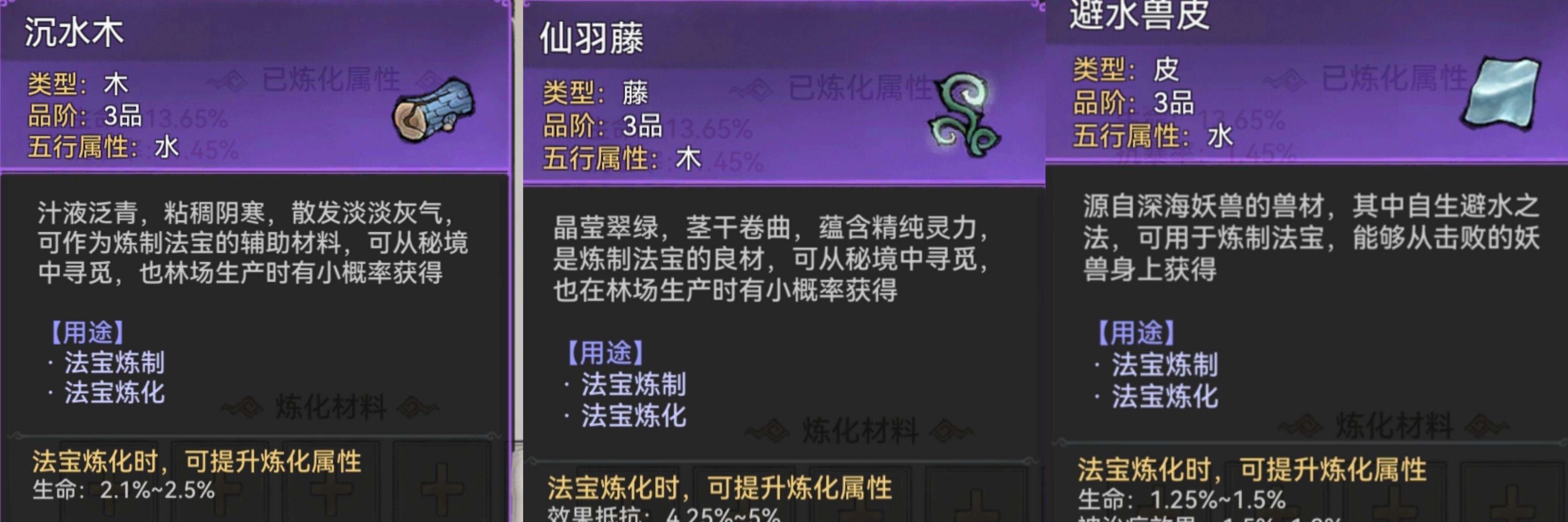 2:【禅修】法宝炼化推荐。①【沉水木】②【仙羽藤】③【碧水兽皮】。