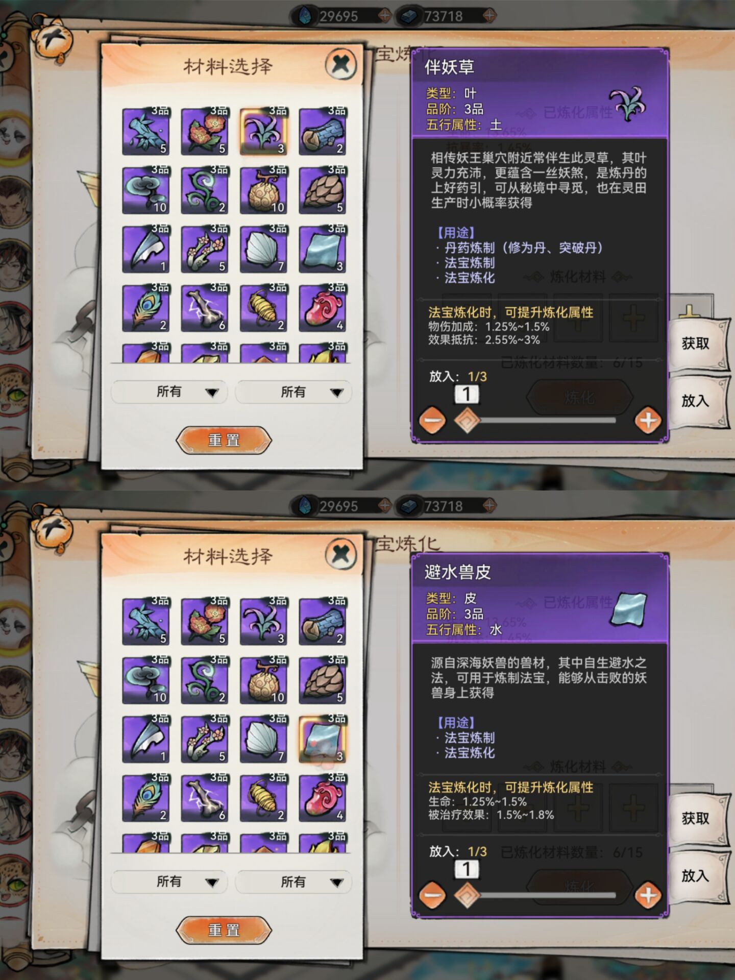 5:【兵家】法宝材料炼化推荐。①【伴妖草】和【避水兽皮】。