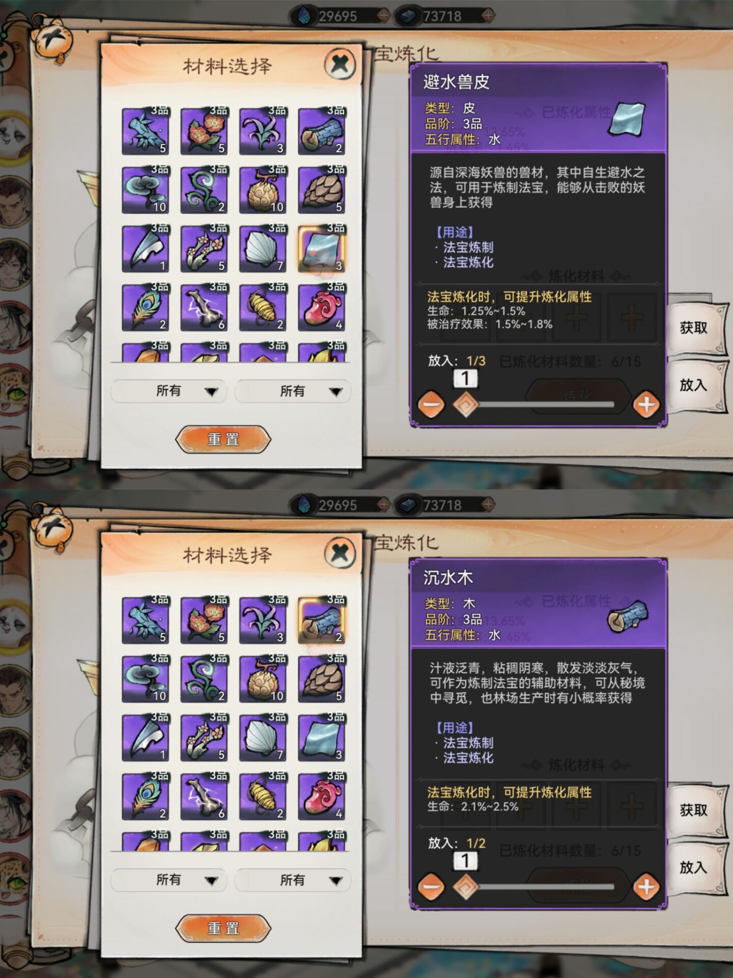 4:【密修】法宝材料炼化推荐。①【避水兽皮】②【沉水木】。