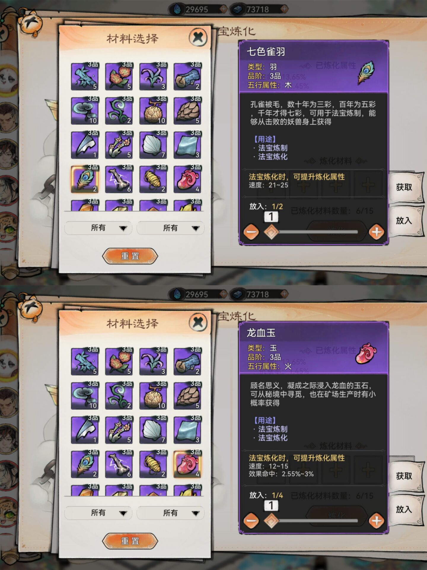 所以隐士的法宝炼化其实和舞姬一样,都是以速度为主,所以选择【七色雀羽】和【龙血玉】。