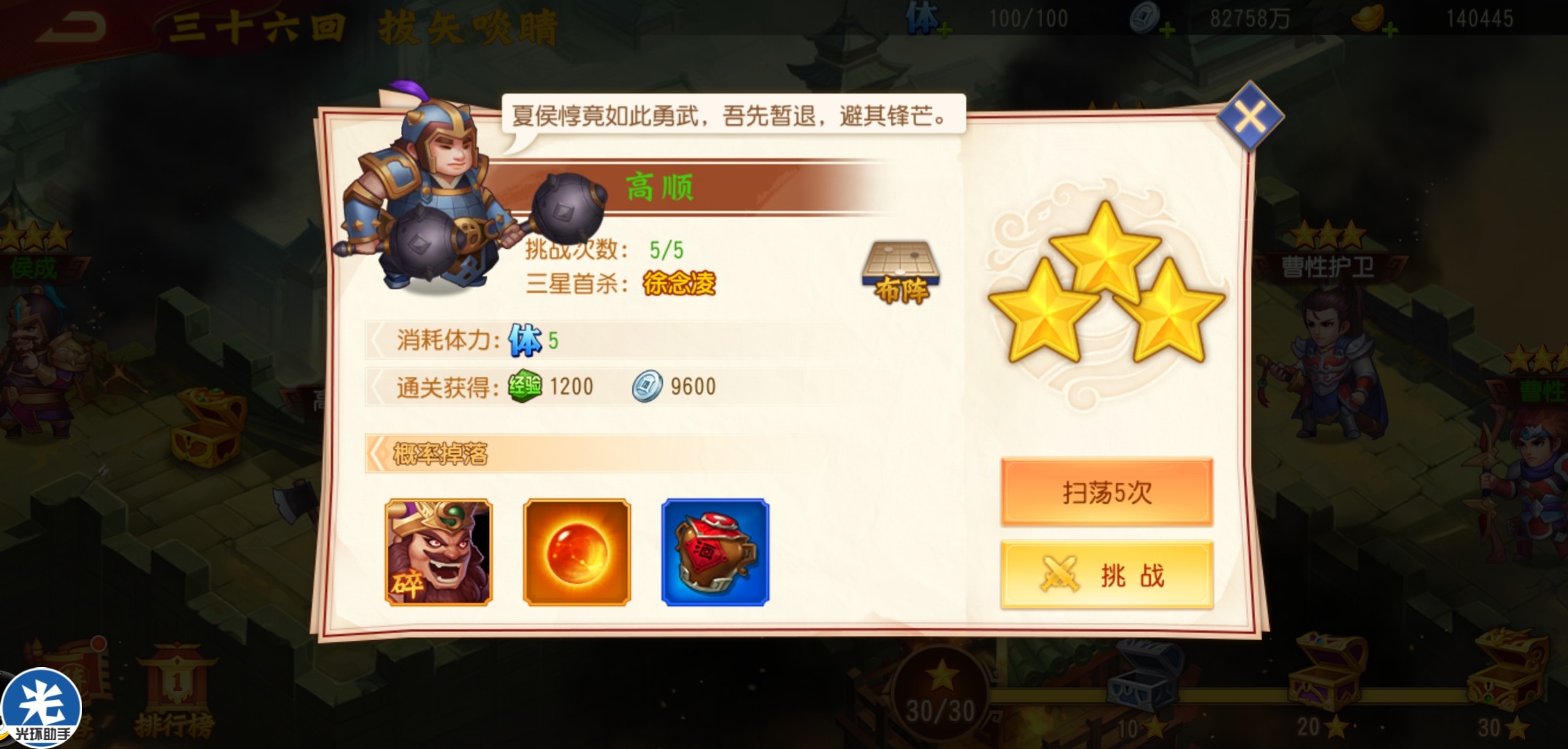 游戏中主线副本36回——“拔矢啖睛”关卡,《三国演义》中夏侯惇那句“父精母血,不可弃也!”的名言,就是出自这次战役。