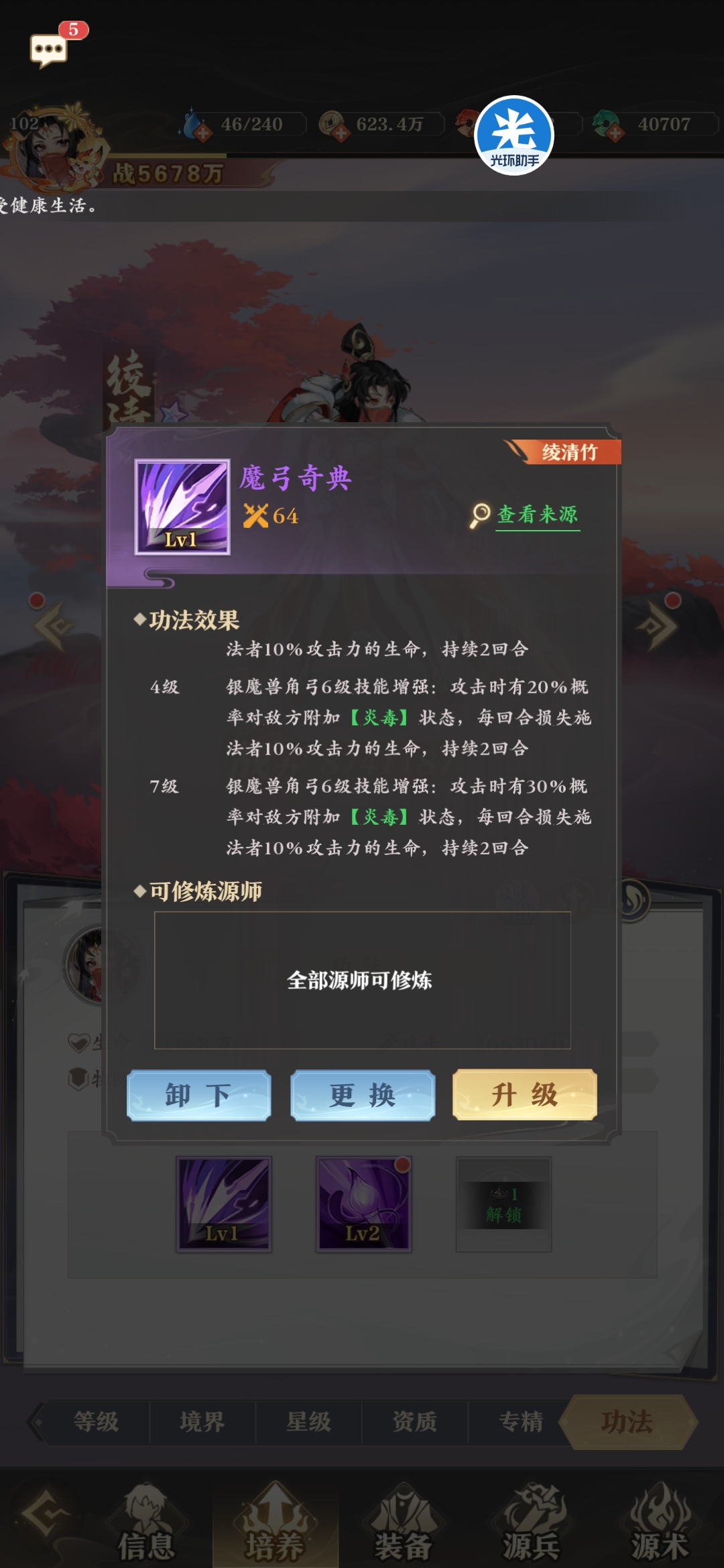 绫清竹携带弓,配合弓的功法可以增加挂毒的种类和几率,更好的配合自身传播毒的天赋。同时携带弓的源师攻击时,还有30%几率延长异常状态1回合。