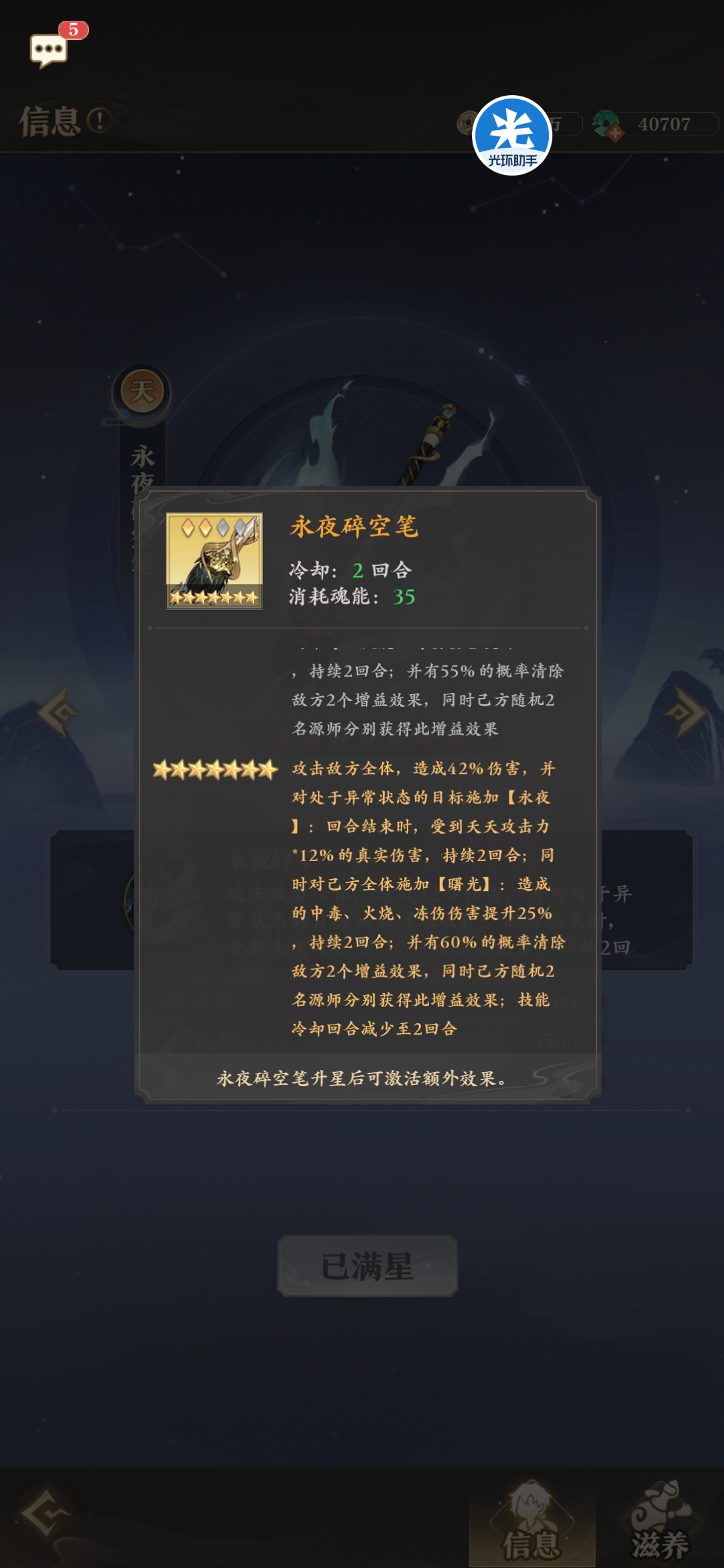 永夜笔为持续伤害队的核心输出之一,自身能打出不俗的真伤,还能增加3种毒25%的伤害,同时还有60%几率偷去敌方增益加给我方。