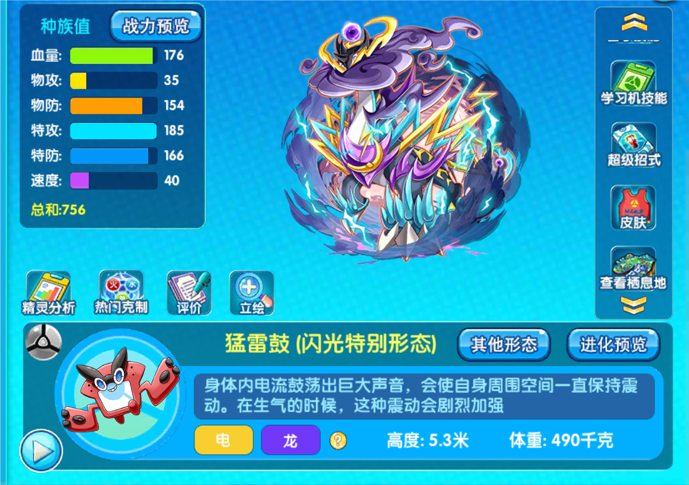性格:保守、冷静,努力值:血量特攻,道具:疯狂面具,特性:超古代雷鼓,超级招式:呼风唤雨狂雷闪