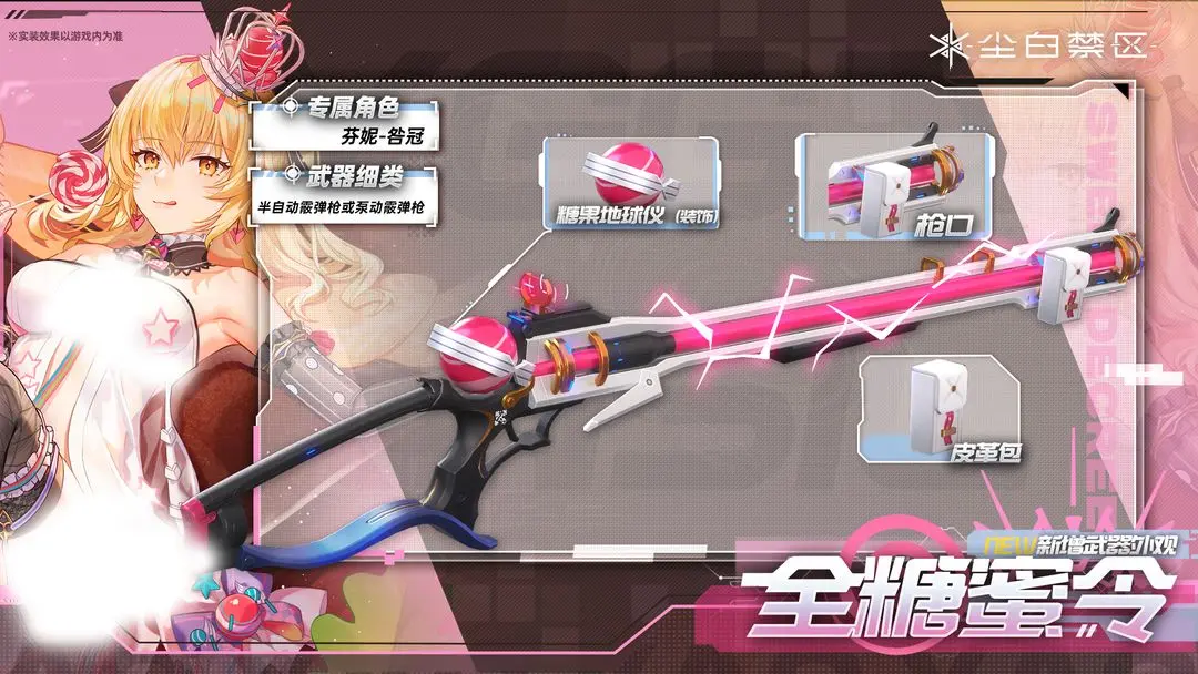 「新增武器外观」光环资讯 - 二次元发布于 2024-02-29关注 【武器外观】全糖蜜令「Sweet Decree 」最近在年轻群体中非常受欢迎的艳丽涂装,经常被当做情侣之间相赠的礼物。专属角色:芬妮-咎冠武器细类:半自动霰弹枪或泵动霰弹枪获取方式:商城限时;分析员可选择单独购买或购买「饴刃组合」礼包获取(礼包包含咎冠角色时装-甜蜜统治及咎冠武器外观-全糖蜜令)。※实装效果以游戏内为准