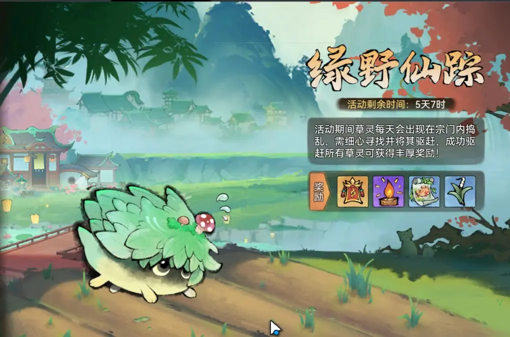 还有一个很重要的是限时开启的绿野仙踪,我们在去除杂草的过程中会触发草灵,十分钟去除三个草灵后即可成功,获得一个基础物资产量加成的buff,超时则认定失败,祖师的基础资源生产会被锁定一段时间,无法获得资源产出。我们需要的就是这个产量加成的buff。