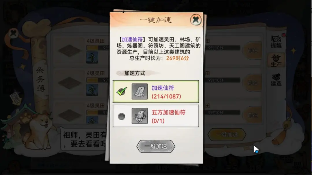 那么我们这么辛辛苦苦提高我们的资源产量有什么目的呢?聪明的祖师大人已经反应过来了,那就是小清瑶接下来说的重头戏了,也是产量获得第一的最高诀窍:在保证产量加成最高的情况下使用我们的加速仙符!!!