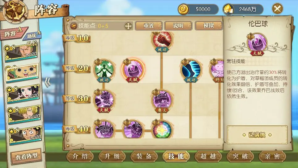 伦巴球这个天赋的核心在于提升了和之国草帽团的承伤能力,和之国乔巴本身治疗能力就比较强,配合乔巴的怪物强化时间延长、信念、柔术、主动技能医疗药剂,能够为和之国草帽团提供很厚的护盾,不论是抗住敌方UR花魁阿玲的AOE伤害,还是拖延敌方和之国佐罗减员我方的速度都是比较关键的胜负手。