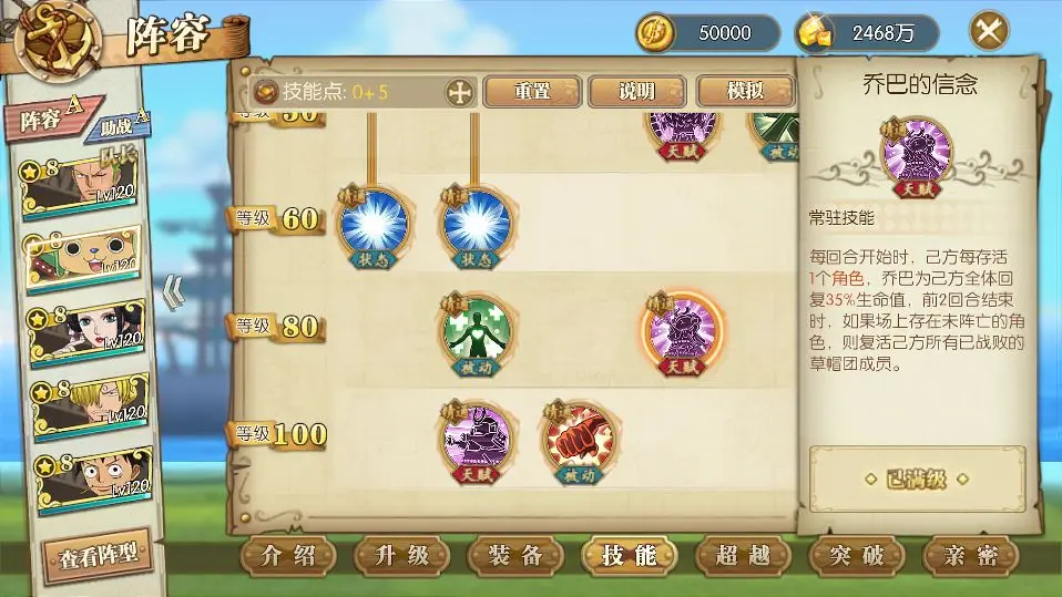 和之国乔巴另一个提升草帽团生存能力的方面在此,只要第一回合保证不被清场,第二回合草帽团就会被乔巴复活,再进行一轮战斗;搭配天赋医者的决心效果,能够有很不错的续航能力,保证草帽团在UR花魁阿玲AOE的狂轰乱炸下能够奋起反抗。