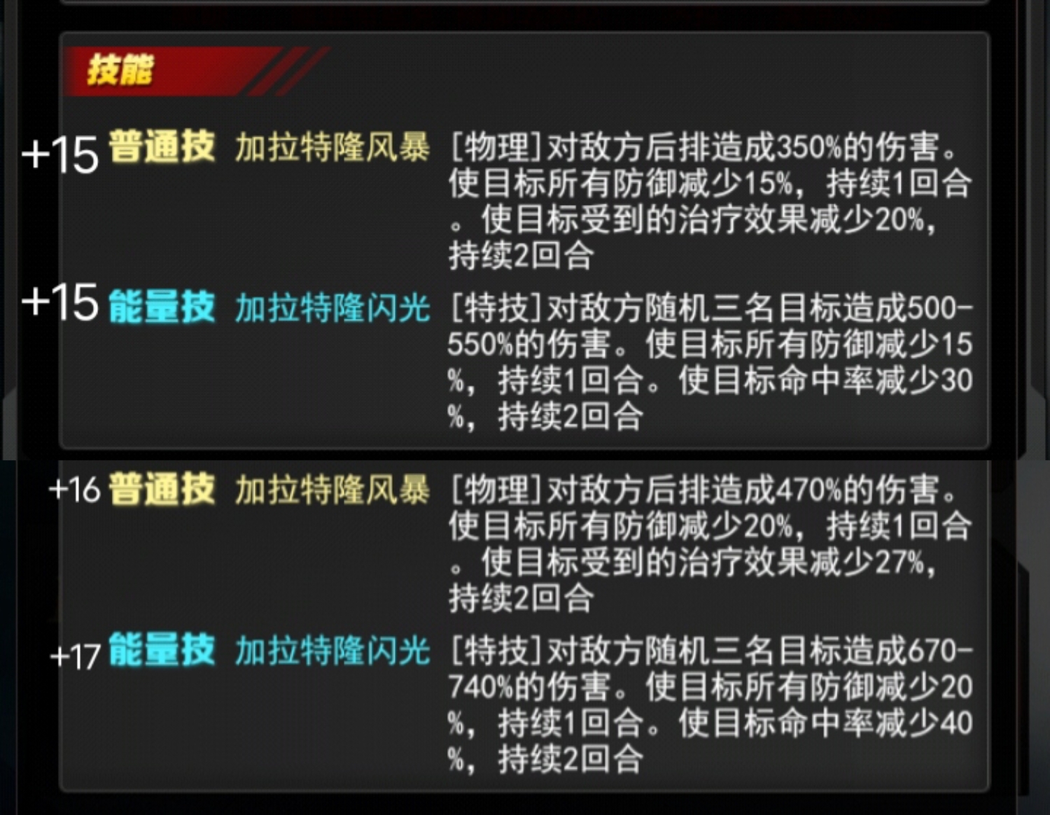 15能量技 加拉特隆闪光[特技]对敌方随机三名目标造成500-550%的伤害。使目标所有防御减少15