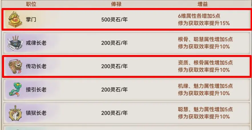 同时还可以任命主输出为掌门,可以增加六维;主前排为传功长老,增加资质和根骨,进一步增强他们的作战能力
