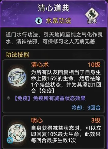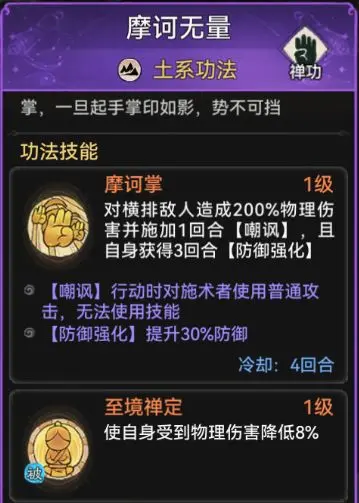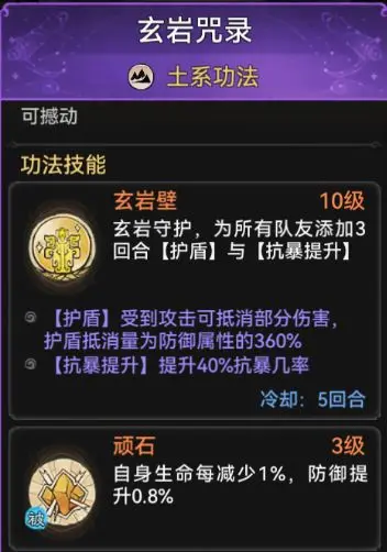 也可佩戴功法玄岩密录或者摩柯无量,玄岩密录开局自带被动,生命值越少防御越高,摩柯无量也拥有开局减少物理伤害的被动,同时这两个功法的主动技能也可以增加不少生存能力。