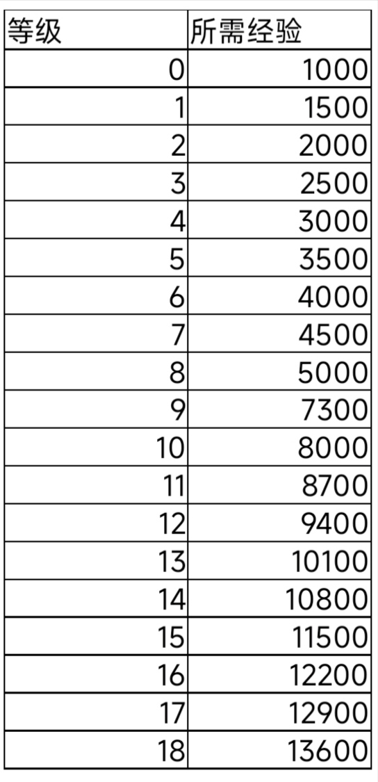 所需经验表(部分)