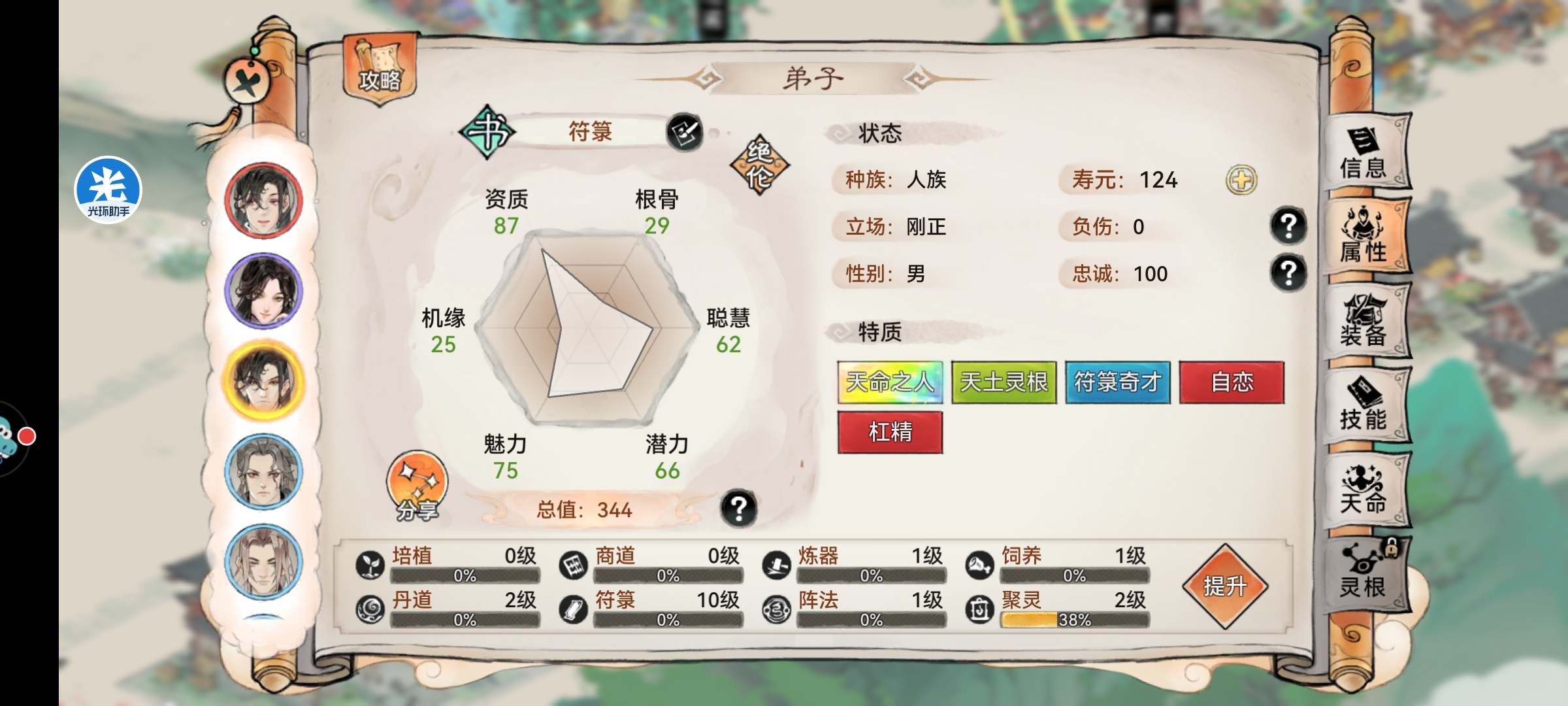 但是我们获取能力经验的速度还是有点慢,那怎么办呢那就是不要看见没有奇才六维又不高的就放弃掉,可以注意看有没有能力等级高的,拿我这个来说,自带符箓10级,
