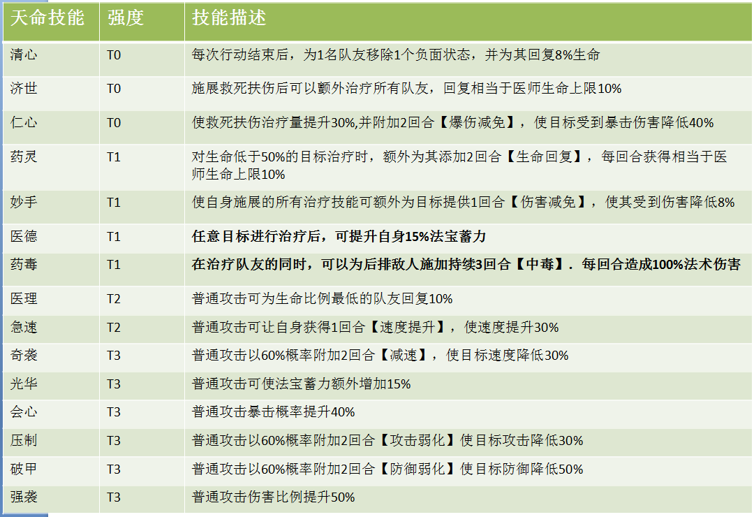 这个天命技能也非常给力,因为不仅技能有用,功法的治疗也能够增加生命回复。大幅度加强医师的治疗力,所以强度给到T1。