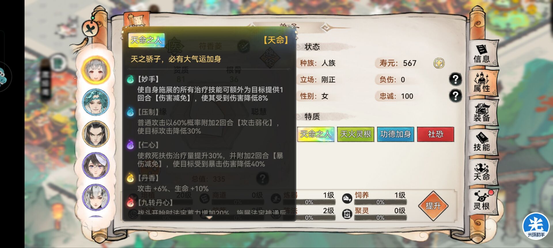 这个效果还是非常给力的,每次行动都能清除1名队友的负面,配合上功法【清心道典】和技能【救死扶伤】净化能力拉满,强度也可以给到T0。
