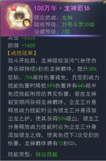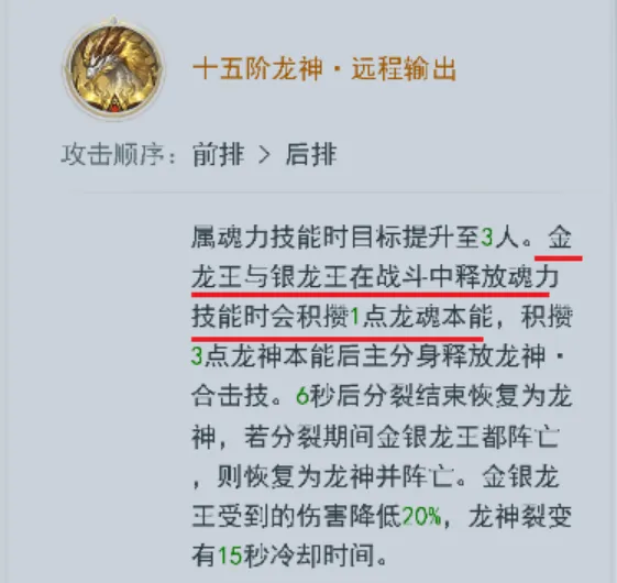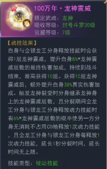 武魂特点:①龙神分裂后,主副分身独立存在(不是召唤物),等于5个角色变成了6个角色;②龙神包括两个分身各自的伤害都不高,但是合击技可以打出质变的伤害,因此我们需要稳定且尽量高频的触发合击效果。金银龙王金龙王分身(单体)
